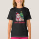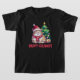 Santa Paws Says Happy Holidays T-Shirt. A chubby cat lounges beside the glittering Christmas tree, eyes half closed in festive bliss, purring softly as if to say, Happy holidays, may your treats be plenty and naps long.
