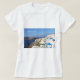 Fotografia alta da definição da vila pitoresca de Oia na ilha da piscina de Santorini que negligencia o que é chamado um Caldera enchido com água. Você pode escolher de muitos estilos das camisas que se usar deixa cair para baixo o menu. Visite por favor a foto de Carolina da loja de Zazzle para ir para outros fotografia e produtos.