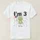 Um aniversário de 3 anos adorável em T-shirts de aniversário de 3 anos, cartas, autocolantes, ímanes, sacos de tote e mais com um sapo verde com balões de aniversário e texto que diz "Eu tenho 3".