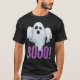The image features a stylized ghost with a floating white sheet and black eyes and mouth, giving a spooky appearance. Below the ghost, the word "BOOO!" is written in bold purple uppercase letters with a black shadow, emphasizing the scary effect. This image is interesting and relevant for Halloween themes, costume parties, or any context involving scares and fun.