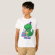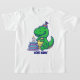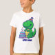 Um pequeno dinossauro T-Rex está sorrindo e vestindo um chapéu de aniversário enquanto se senta com seu bolo de segundo aniversário. Um presente adorável para seu filho de dois anos!