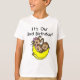 Três macacos pequenos, duas raparigas e um rapaz, e uma grande banana amarela em T-shirts de segundo aniversário Triplets, fato físico, sacos de tote, cartões, autocolantes, ímanes e muito mais.