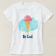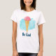 Camisa com um cone de sorvete com uma colher de sorvete de morango (rosa). O texto diz "seja legal" com uma fonte com aspecto gelado. Colocado num penso/pincelada de tinta azul-aqua.