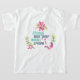 uma camiseta branca com uma mensagem inspiradora e poderosa: "Sempre vista sua coroa invisível", escrita em uma fonte na moda, colorida. O design é adornado com elementos florais vibrantes, incluindo flores cor-de-rosa, folhas verdes e espirais decorativas, juntamente com um pequeno símbolo da coroa. A frase encoraja a autoconfiança e a força interior, lembrando ao usuário que se carregar com graça e dignidade, mesmo quando ninguém mais a vê. É uma peça de roupa alegre e motivacional que celebra o valor pessoal e o amor próprio.