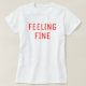 Uma camiseta simples e fofa com as palavras 'Feeling Fine' impressa na zona do peito dianteiro, em cor vermelha. É bonito autoexplicativo, não é? É a resposta perfeita para todos que perguntaram a vocês "como vocês estão se sentindo?" Mesmo que você não esteja se sentindo bem, você tem que fingir até conseguir, certo? Direita!