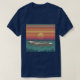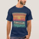 Esta design de camiseta captura a beleza tranquila de um barco que se cruzava suavemente em águas calmas durante um pôr do sol vibrante. O barco, rendido com linhas limpas e estilo minimalista, se senta pacificamente em ondas turquesas que refletem as cores do sol de pôr. O fundo apresenta um pôr do sol espantoso, com o sol posicionado no chão no horizonte, irradiando tons quentes de amarelo, laranja, rosa e roxo através do céu. O céu é representado por linhas horizontais que criam um efeito gradiente, acrescentando profundidade e senso de calma à cena. Abaixo da superfície da água, pode-se ver a silhueta das plantas submarinas, reforçando o sentimento natural da ilustração. Essa design evoca um senso de relaxamento e aventura, fazer perfeito para amantes de temas náuticos e paisagens serenas.