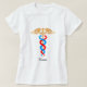 Símbolo de Caduco em ouro, azul e vermelho em T-Shirt branca. O texto pode ser personalizado. Ideal para enfermeiros, estudantes de medicina, médicos e qualquer pessoa que se preocupe com equilíbrio e saúde.