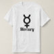 Uma t-shirt branca com o símbolo de Mercúrio com o texto Mercúrio por baixo dela. Você pode personalizar esta t-shirt para alterar a cor da fonte, alterar o tamanho e o tipo da letra e muito mais para transformá-la em sua própria t-shirt exclusiva.