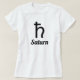 Uma t-shirt branca com o símbolo de Saturno com o texto Saturno por baixo dela. Você pode personalizar esta t-shirt para alterar a cor da fonte, alterar o tamanho e o tipo da letra e muito mais para transformá-la em sua própria t-shirt exclusiva.