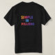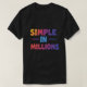 A imagem mostra um design de vetor plano de uma camiseta com a frase "Simples em Milhões" escrita em uma fonte colorida e ousada. O texto é grande e centrado na camisa, e está rodeado por uma variedade de formas e padrões coloridos. O design geral é brincalhão e atraente, e ele se destacaria com uma camiseta.
