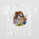 Este design de gótico floral apresenta uma garota esquelética com seu gato kawaii giro cercado por flores.