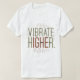 A t-shirt apresenta o texto "Vibrate Mais alto" num espectro de cores vibrante. Cada letra flui para o próximo como uma onda, criando um olhar dinâmico e energético.