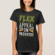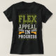 Uma t-shirt com o slogan motivador "Flex Appeal In Progress" em texto colorido tipografia e gráficos, incluindo sinos e fitas.