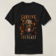 A design apresenta um peru humanoide em pé com as mãos unidas em uma pose refletiva e refletiva. A sua expressão é calma, mas humorada, como se contemplasse o seu destino durante o banquete de Ação de Graças. Ao redor do peru estão folhas caídas espalhadas em vibrantes tons de outono de vermelho, laranja, amarelo e marrom, acrescentando um toque sazonal festivo. As palavras "Sobreviver" e "o Banquete" são escritas a negrito, com "Sobreviver" gravado acima do peru e "o Banquete" colocados abaixo, moldando o design em uma composição lúdica e equilibrada. Esta design visualmente espirituosa e engajada combina humor com espírito de Ação de Graças, fazer-a perfeita para camisetas ou mercadorias de temas de férias.