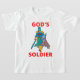 A camiseta desta menina tem as palavras Soldado de Deus em uma impressão ousada e letras vermelhas com um soldado em armário de cheio ou segurando uma espada e um escudo no centro com um tema baseado na fé. Esta camisa apresenta um ajustado relaxado para a forma feminina feita a partir de 100% de algodão esta camisa é durável e macia que faz uma combinação de excelentes.