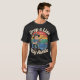 Este design apresenta uma t-shirt preta com o texto "Drop a Line" curvada no topo e "Keep Awhile" curvada no fundo numa letra branca estilizada. No centro está um desenho animado de um menino pescando em um lago com um pôr do sol ao fundo.