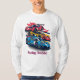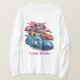 Uma composição dinâmica de três carros desportivos, sobrepostos e em camadas para criar um sentido de velocidade e movimento. As cores ousadas e os designs estilizados evocam a energia e o entusiasmo do mundo das corridas