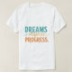 O design t-shirt apresenta o texto "Dreams Inspiram Progress" num gradiente ousado, multicolorido, a partir do vermelho e terminando em roxo. As cores se misturam perfeitamente, criando um efeito vibrante e atraente para os olhos. A fonte é moderna e dinâmica, transmitindo um sentido de energia e otimismo. O design geral é simples mas impactante, fazer adequado para várias ocasiões.