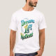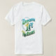 A camiseta apresenta o texto em negrito "Dreams Lift Nations" em uma fonte dinâmica e elevadora. A frase é provavelmente centrada no peito e pode ser acompanhada por um fundo sutil ou por um elemento gráfico que simboliza unidade, crescimento ou aspiração. O design geral visa inspirar e empoderar, transmitindo uma mensagem de potencial coletivo e de poder transformador dos sonhos.