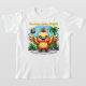 Um pintinho amarelo alegre com olhos brilhantes e bochechas rosadas espalha suas asas com entusiasmo. Uma abelha amigável paira perto. As palmas verdes e o céu azul criam uma sensação tropical quente. A frase "Sorrisos voam" em letras amarelas melhora o humor alegre.