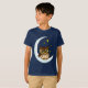 Uma coruja-bebê marrom giro e giro sentada em uma lua com estrelas ao redor em pano de fundo azul