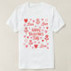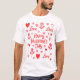 This is a white t-shirt with the word Love and red and pink hearts, flowers, and Text.