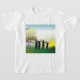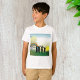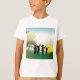 Uma cena de crianças em pé no nascer do cheio e um arco-íris. Esta design parece realmente eficaz nesta camiseta