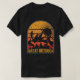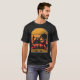 Esta camiseta preta apresenta um gráfico retrô, arquitetado com um pôr do sol vibrante ou uma cena do sol em tons de laranja e vermelho. São representadas silhuetas de montanhas, pinheiros e um caminhoneiro com varões. Pássaros voam através do céu enquanto os raios do sol se estendem para fora. O texto "EXCELENTE OUTDOOR" é escrito em negrito, ligeiramente angustiado, na parte inferior do gráfico. Esta design celebra a beleza e aventura do mundo natural.