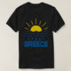 Aproveite este verão com esta camiseta preta masculina do sol e das ondas do mar de Syros, Grécia. Este design apresenta ondas de sol e água com Syros em fonte estilo grego com uma grande palavra azul Grécia.