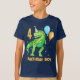 Um design para uma comemoração pré-histórica para o seu aniversariante com uma mão pintada de giz-d-água, um dinossauro feliz, fofo, t rex com balões de festa e confetti, na parte de trás da camisa está um vulcão. Você pode modificar a idade e o texto nesta design para dizer o que quiser. Consulte a coleção de partes correspondentes.
