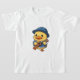 This design features a charming cartoon of a chubby yellow duckling enjoying a musical moment. The character is dressed in a cute outfit consisting of a dark blue bucket hat and a matching blue jacket with white trim. It is holding a wooden brown ukulele, strumming the strings with its wings. The duck has a joyful expression with a slight smile, rosy cheeks, and one orange webbed foot raised as if dancing to the rhythm against a plain light gray background.