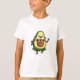 A cheerful cartoon avocado character in a hula dancer outfit. The smiling fruit mascot is wearing a green leaf grass skirt and a vibrant lei made of red and white hibiscus and frangipani flowers while dancing and waving.