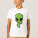 A cute green alien stands cheerfully against a deep black background, flashing a friendly peace sign. Its oversized head, smooth round shape, and large glossy black eyes give it a playful, approachable personality. Subtle highlights and clean outlines create a polished cartoon look, while the simple pose and bright green color make the character feel lighthearted and fun. The overall illustration blends sci‑fi charm with adorable kawaii style.