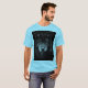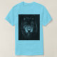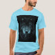 Camiseta azul de homem com um lobo negro com branco no nariz.