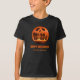 Camiseta Spooky Halloween com uma abóbora laranja Jack-o-lanterna com um rosto esculpido e gritante. Inclui uma mensagem personalizável como "Feliz Dia das Bruxas" "Booo Boooo Boooo" ou "Trick or Tratat". O design destaca-se com seu efeito tridimensional e sombrio e adiciona um toque especial ao seu equipamento de Halloween.
