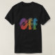 Um design de t-shirt com o texto "OFF" numa fonte futurística pixelizada, com uma paleta de cor neon. O design evoca um sentido de tecnologia e ciberpunk, com uma vibração lúdica e enérgica. DESIGN de camiseta OFF Fonte flexível Pixelada neon cores Cyberpunk Tecnologia inteligente moderna Tendy Graphic design de moda Roupa de moda
