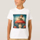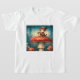 Uma t-shirt decorada com um pixie fofo e um gatinho sentado num cogumelo