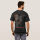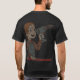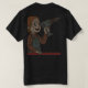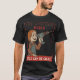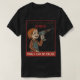 Um homem modela uma camiseta preta com um desenho animado de uma criança com aparência sinistra em macacões com uma furadeira grande, limitada por um retângulo vermelho com os avisos "USE WITH CARE KIDS" e "TOOLS CAN BE CRUEL".