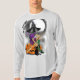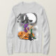 Hoje à noite voamos. Uma bruxa "não muito assustadora" sentada na mancha de abóbora com seu gato preto, pronta para salto na vassoura e voar durante a noite de Halloween.