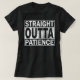 Esta engraçada design de Outta Patience foi inspirada por vários outros designs que vimos surgindo no mercado e decidimos adicionar nossa própria marca de talento sarcástico a ela. Está disponível em vários outros produtos no mercado Zazzle, incluindo esta camiseta humorística. Vestir essa camiseta e sobre isso pode não ajudar você a fazer amigos, mas então, novamente, ela pode fazer uma conversa interessante e, se nada mais, o pessoas saberá exatamente como você se sente.