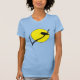 O beija-flor no galho, a silhueta contra um sol amarelo. A camisa azul simula o céu.