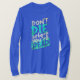 A imagem mostra uma pessoa vestindo uma camiseta azul-real de manga longa com um design tipográfico ousado e motivacional na frente. O design apresenta a frase "NÃO MORRA antes de você MORTO" em um estilo dinâmico, de pincelada. As palavras "NÃO" e "MORRA" são exibidas em letras grandes, maiúsculas, com uma cor turquesa vibrante, enquanto "antes de você" é escrito em um estilo menor, branco e manuscrito. A palavra "MORTO" também está em maiúsculas, com uma mistura de turquesa e verde, criando um forte impacto visual. O design global tem uma sensação enérgica e crua, com o texto aparentado ser pintado à mão, acrescentando ao tom dramático e motivacional da mensagem.