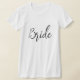 A camiseta feminina é mostrada em um estilo de tripulação e mangas curtas em branco com texto preto: Noiva. Personalize este item ou comprar como está.