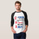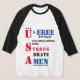 A design de camiseta Patriótica mostra a frase, "EUA é livre porque nossos antepassados eram fortes, homens corajosos" na frente. O verso diz: "E nenhum deles foi vacinado!" As palavras são dispostas de forma agradável de cores vermelha, branca e azul. A redação no verso está em letras vermelhas estênciladas.