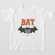 Um morcego preto do Halloween e um texto laranja que diz "BAT" em t-shirts de morcegos, fatos, canecas, cartões, autocolantes, sacos de tote, botões, ímãs e outras t-shirts e presentes MTD do Halloween.