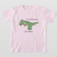 Ein T-Shirt mit einem lustigen T-Rex Cartoon: T-Rex mit einem Lollipop. Text: "T-Rex tiny arms hates lollipop"