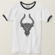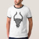 Este símbolo estilizado para o sinal do zodíaco do Taurus é decorado com linhas e padrões de ponto intrincados. As características de design simétricas uma cabeça elaborada do touro com grandes chifres que fluem para cima e um anel nele são nariz. Um símbolo pequeno para o Taurus é caracterizado na parte de trás da camisa situada apenas sob o colar. Este design preto e cinzento impressionante é uma maneira bonita e à moda de mostrar fora seu sinal astrológico.