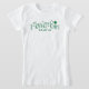 Esta camiseta verde e branca "Flor Girl" tem um trevo verde sortudo de 4 folhas na frente como o ponto do "i". Personalize-o para ter a data do casamento ou outro texto nele.