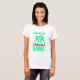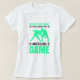 Uma adolescente humorística que apresenta um pedido de desculpas divertido por ações durante um jogo de luta. A impressão verde se destaca contra a camisa branca, fazer uma peça divertida e atraente