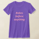Faça uma declaração com esta "Bebês Antes de Qualquer Coisa"—uma design ousada e poderosa para aqueles que priorizam a confiança, amizade e amor próprio. Apresentando uma paleta de cores única e inspirada por retrorreflectores e uma tipografia atraente, esta camisa é perfeita para qualquer pessoa que ame estética vibrante e energia destemida. Quer você o estime por uma noite fora, um dia casual, ou uma celebração de Galentine, isso é sobre abraçar seu poder da forma mais indesculpável
